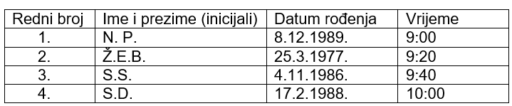 U utorak 3. ožujka 2026. pozivaju se prema rasporedu sljedeći kandidati: